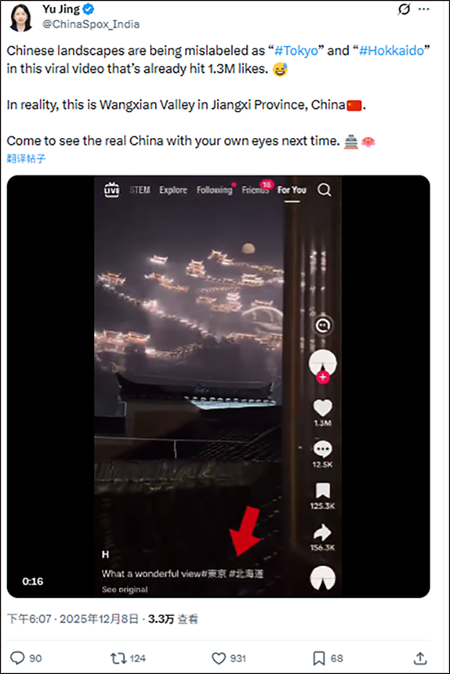 近日,一段关于中国江西上饶望仙谷美景的视频在外网爆火,但却被很多账号错误标注为日本“东京”或“北海道”。当地时间12月8日,中国驻印度大使馆发言人宇静在X平台上发帖辟谣:“这段已获得130万点赞的热门视频中,中国的风景被错误地标注为东京和北海道。实际上,这是中国江西的望仙谷。”