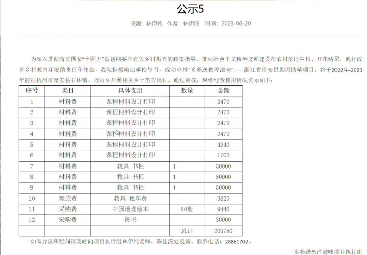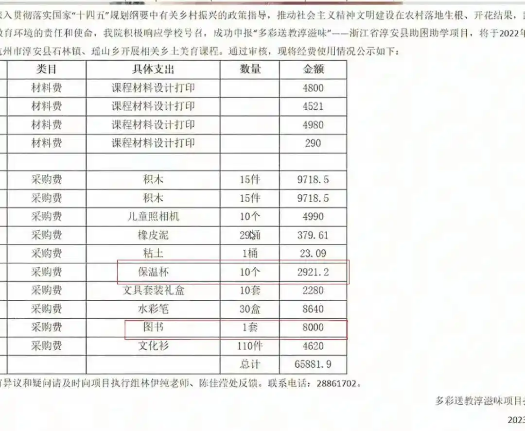 通报公布的45万元资金使用情况中,15万元被用于杭州市淳安县山区小学图书馆购置书架,9.3万余元被用于课程设计及教材选编,10万余元被用于购置学习用品资助留守儿童,5.5万余元被用于购买图书资料,4.5万元被用于支教人员差旅费,相关税费5625元。项目的受益对象为淳安县两所山区小学学生。