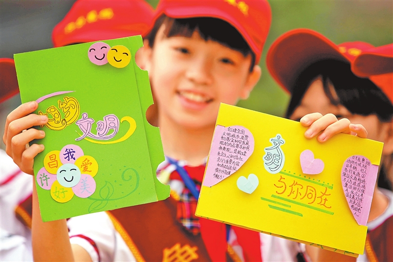 许昌市古槐街小学的学生们来到市区街头,向市民游客发放自己亲手绘制的“文明卡”,宣传创建文明城市常识。 牛书培 摄