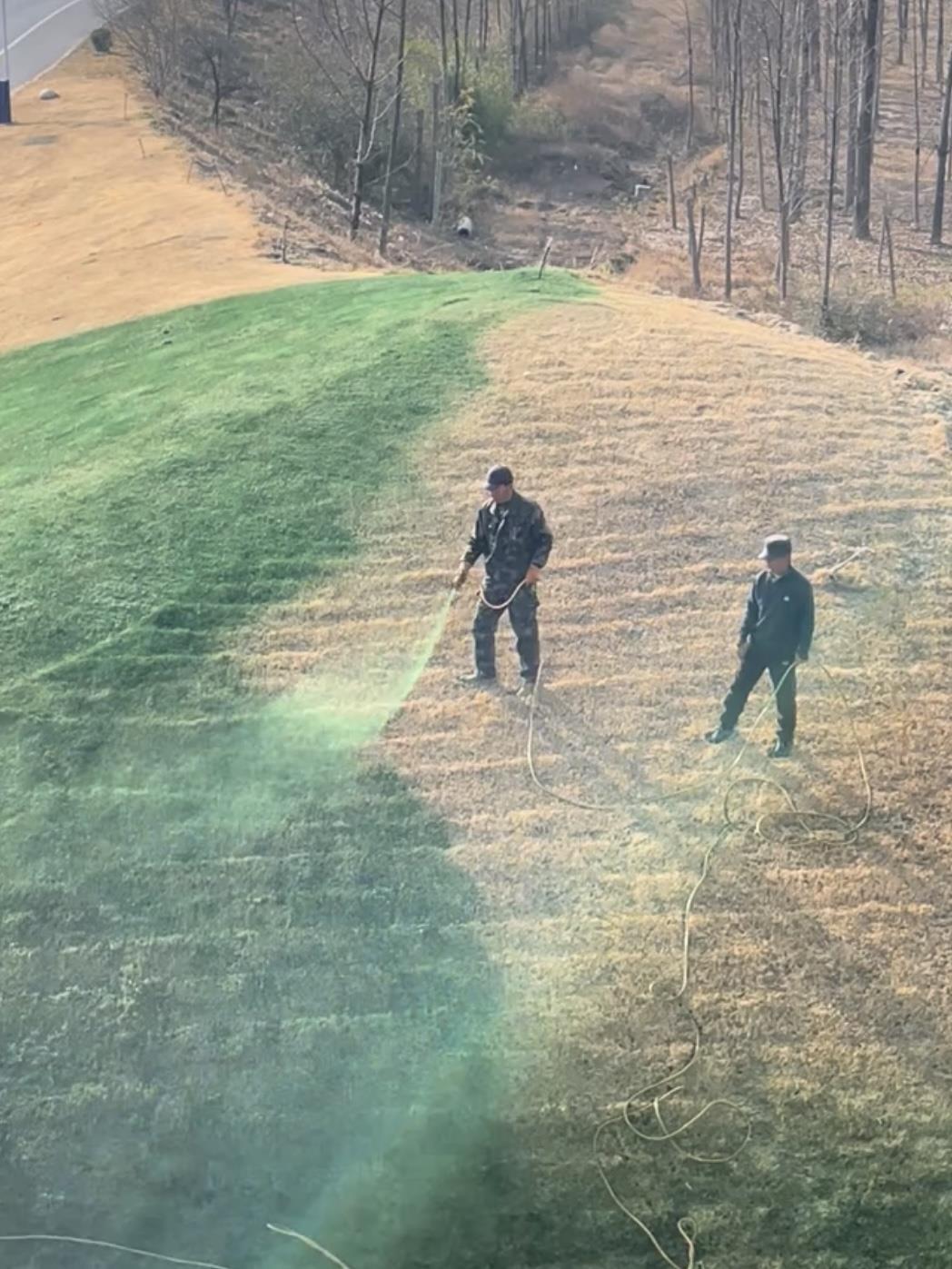 视频显示,路边一处枯黄的草地上,两名男子正用设备将绿色液体喷洒到草地上,枯黄的草皮瞬间变成绿色。视频配文写道:“草坪绿化,绿草如茵。”