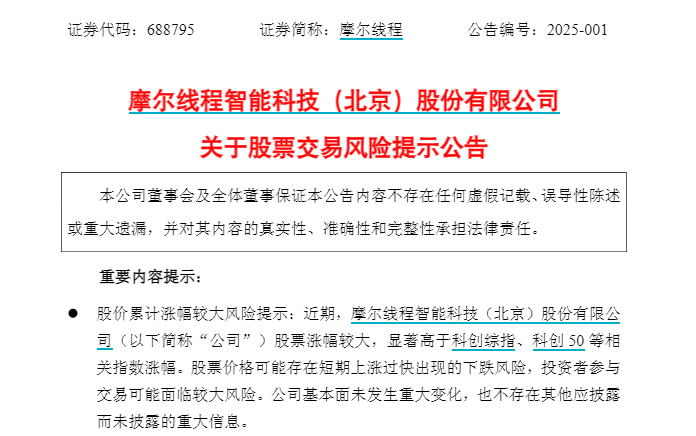 【大河财立方消息】 12月11日晚间,摩尔线程发布风险提示公告称,近期公司股票涨幅较大,显著高于科创综指、科创50等相关指数涨幅。股票价格可能存在短期上涨过快出现的下跌风险,投资者参与交易可能面临较大风险。