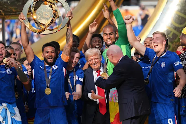 而最令人哭笑不得是,原本最后世俱杯决赛的奖杯,作为颁奖嘉宾的特朗普,原本是需要将奖杯递给冠军切尔西的队长里斯·詹姆斯,谁知特朗普递过奖杯后,自顾自的站在了领奖台的最C位。切尔西队长詹姆斯愣了一下,最终还是举起奖杯,同特朗普一同欢呼。