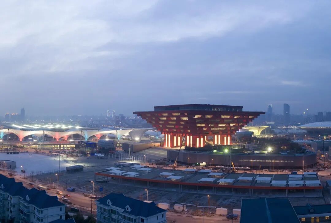 经过整合设计,中国馆采用斗拱形式、红色外观,为了在不同光照下都能闪耀中国红,设计团队用了7种深浅不一的红色面板,最终为世界呈上了一顶绚丽的“东方之冠”。