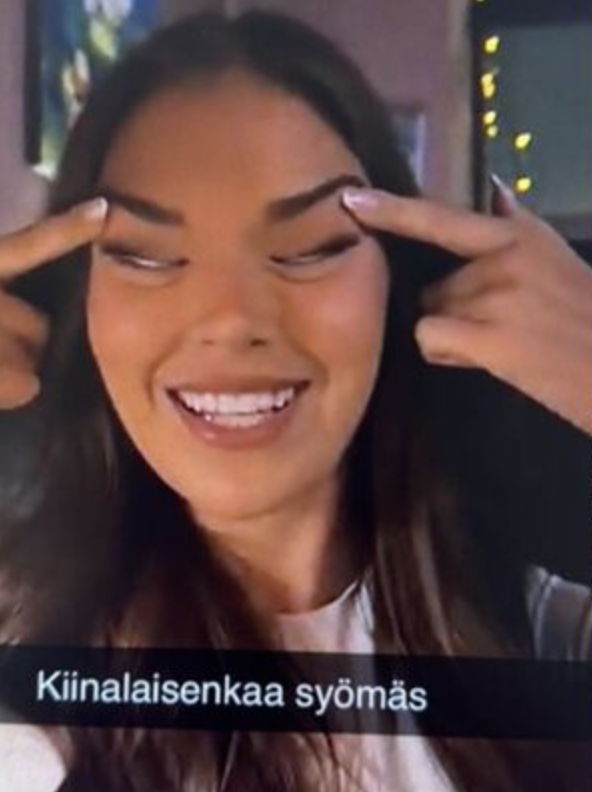 这段视频中,她故意做了个手掰眼角的“眯眯眼”动作,结合字幕里的“中国人”,种族歧视的意思不言自明...