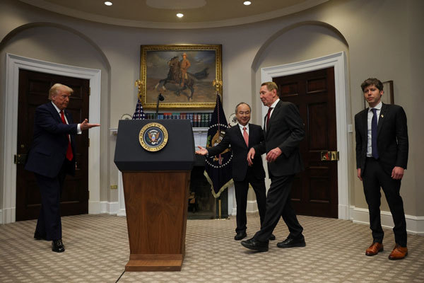 当地时间2025年1月21日,美国华盛顿,美国总统特朗普邀请美国甲骨文公司创始人拉里·埃里森(右二)发言。 东方IC