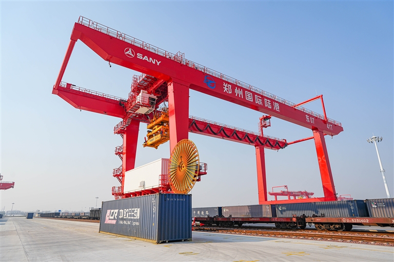 来到位于郑州航空港东南部的郑州国际陆港核心功能区——中欧班列(郑州)集结中心,只见大型龙门吊在繁忙作业,一个个装满货物的集装箱被轻松“拿捏”。
