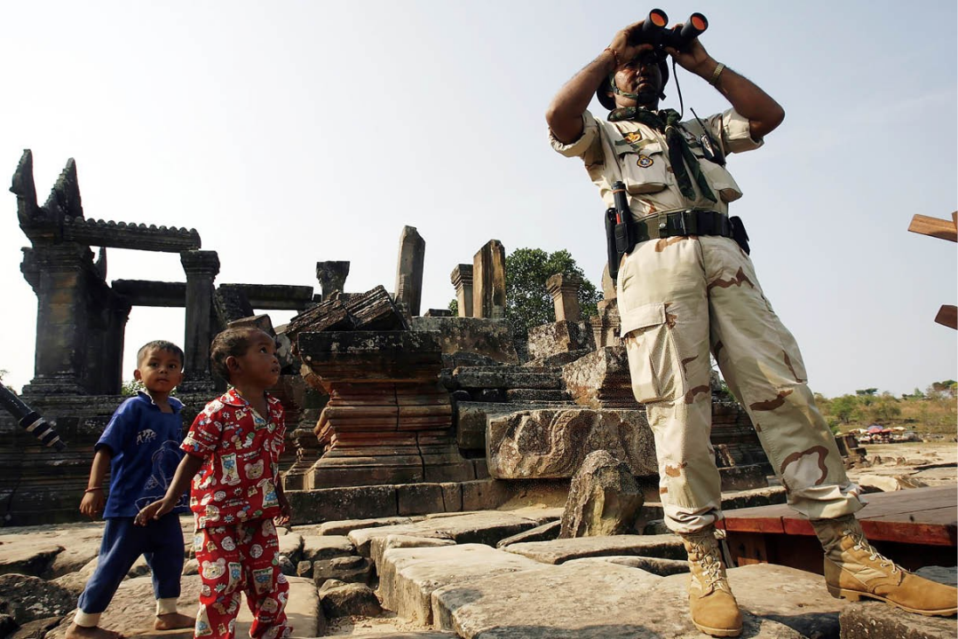 2009年3月13日拍摄的资料照片显示,两个孩子在柏威夏寺注视着一名正在警戒的士兵