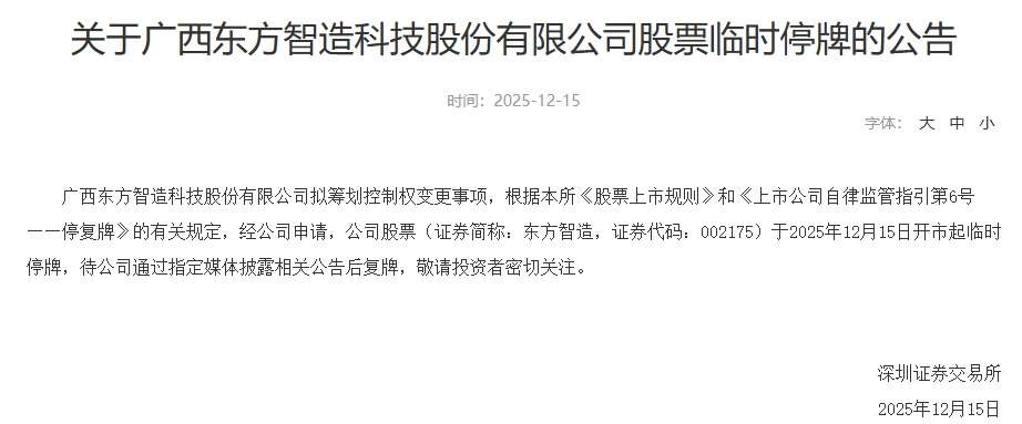 【大河财立方消息】12月15日,深交所发布公告称,广西东方智造科技股份有限公司(证券简称:东方智造,证券代码:002175)拟筹划控制权变更事项,根据有关规定,经公司申请,公司股票于2025年12月15日开市起临时停牌,待公司通过指定媒体披露相关公告后复牌。