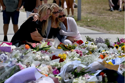 ▎悼念者在悉尼邦迪海滩枪击事件遇难者的花束旁聚集哀悼。(图源:法新社/盖蒂图片社)