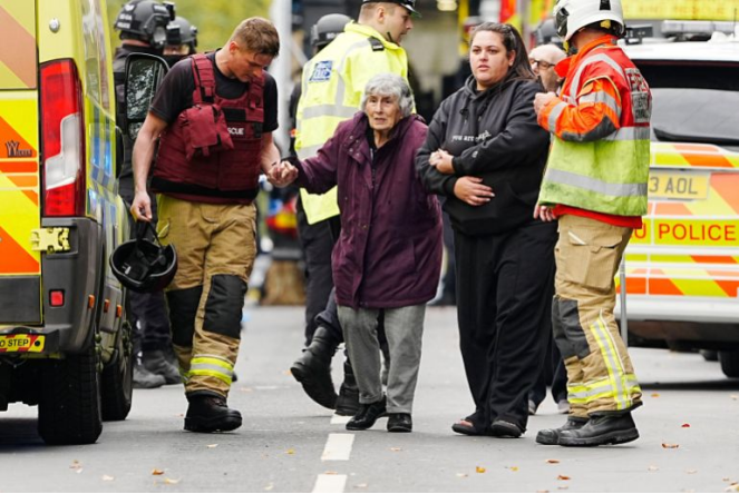 ▎2025年10月2日,一名老妇人在曼彻斯特的希顿公园犹太教堂外发生持刀伤人事件后被搀扶离开现场。(图源:PA /美联社)