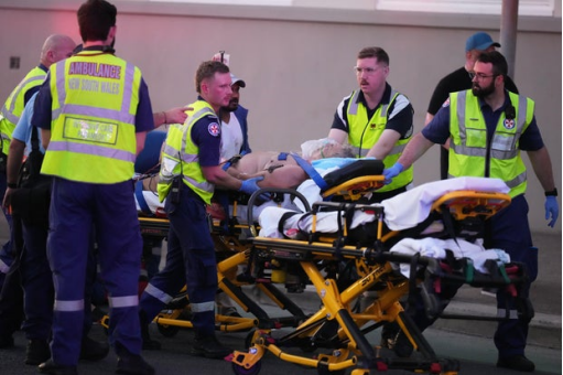 ▎应急救援人员在邦迪海滩袭击现场用担架转运伤者。(图源:美联社)
