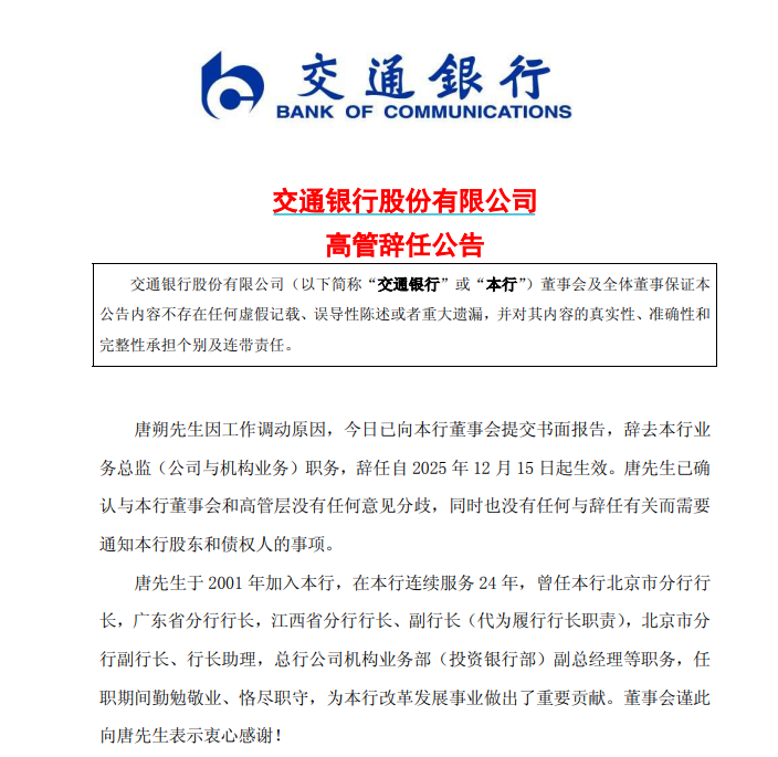 【大河财立方消息】 12月15日,交通银行公告,唐朔因工作调动原因,已向董事会提交书面报告,辞去业务总监(公司与机构业务)职务,辞任自12月15日起生效。