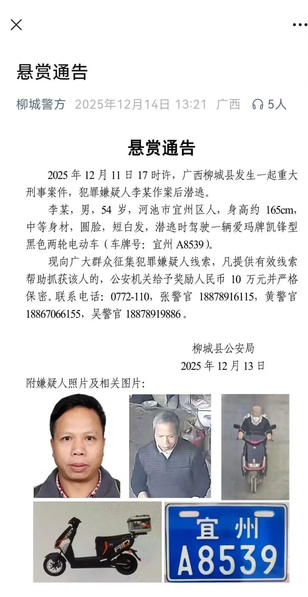 当地警方另发布悬赏通告称,李某身高约165厘米,中等身材,圆脸,短白发,逃跑时身穿黑色上衣,驾驶爱玛牌凯锋型黑色两轮电动车(九成新),车牌号为宜州A8539。凡提供线索帮助抓获该人员的,给予奖励10万元。