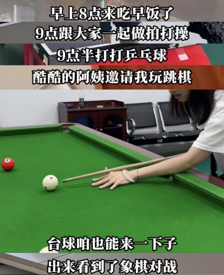 他们早上吃完早饭后,会做拍打操、广播体操,还会打乒乓球、玩跳棋、打台球、下象棋……