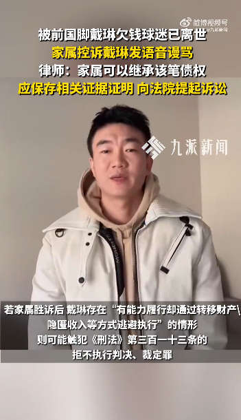 近日,前国脚戴琳被曝欠山东泰山球迷潘某7万元不还,潘某索要欠款时遭到戴琳言语辱骂。12月15日晚,潘某姑姑在社媒发文确认其离世,同时文中控诉戴琳欠钱不还等行为。