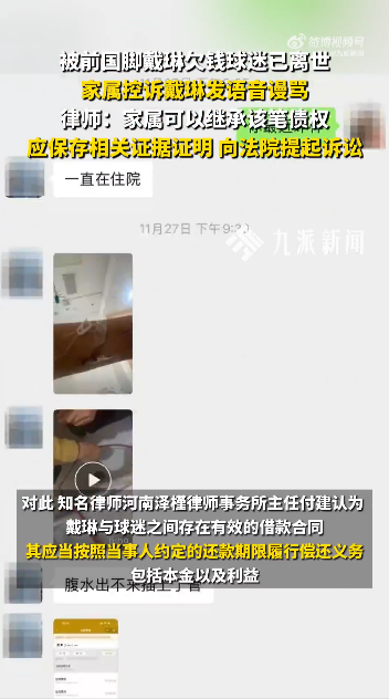 对此,知名律师河南泽槿律师事务所主任付建告诉九派新闻,戴琳与球迷之间存在有效的借款合同,其应当按照当事人约定的还款期限履行偿还义务,包括本金以及利益。而其多次承诺还款却不兑现,拒绝履行义务,属于逃避债务的行为。该债权债务关系不会因为一方离世而消灭,球迷家属作为遗产继承人可以继承该笔债权。如果戴琳的辱骂行为给球迷家属带来生活困扰的,也有权主张精神损失。球迷家属应当保存欠条、催款记录等能够证明债权债务关系的证据,球迷的死亡证明以及亲属关系的证明等,向法院提起诉讼,并向法院申请冻结戴琳银行账户、查封财产,防止其转移资产。