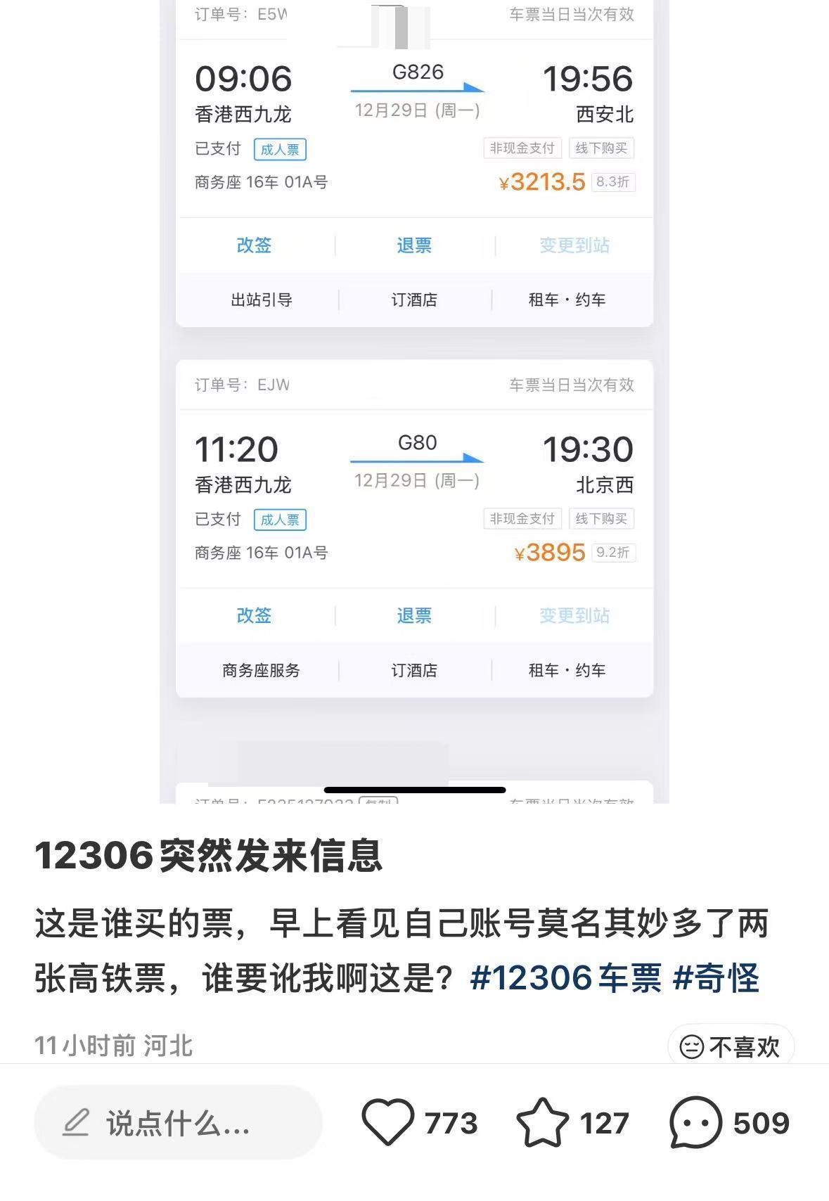 网友杨女士向极目新闻记者介绍,16日凌晨4时许,她收到“购票成功”的短信。随后,她在12306APP“本人车票”中发现自己名下多出两张从香港出发的高铁票。根据杨女士提供的订单截图,这两张多出的车票发车时间均为12月29日,且均是商务座成人票。一张从香港西九龙站至北京西站,票价3895元;另一张从香港西九龙站至西安北站,票价3213.5元,支付信息均显示为“非现金支付”“线下购买”。