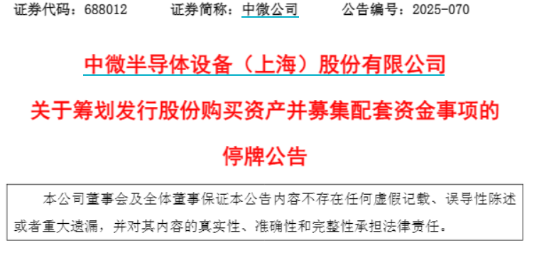 【大河财立方消息】 12月18日,中微半导体设备(上海)股份有限公司(证券简称:中微公司)发布公告称,正筹划通过发行股份方式购买杭州众硅电子科技有限公司(以下简称杭州众硅)控股权并募集配套资金,公司股票将自12月19日开市起开始停牌,预计停牌时间不超过10个交易日。