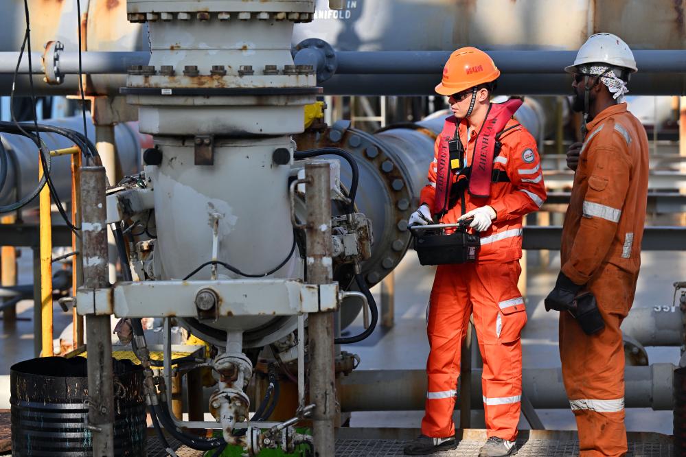 12月18日,装载着石化原辅料的船舶抵达洋浦港后,国投洋浦油储码头工作人员(左)和船舶外籍船员在进行卸油作业。新华社记者 郭程 摄