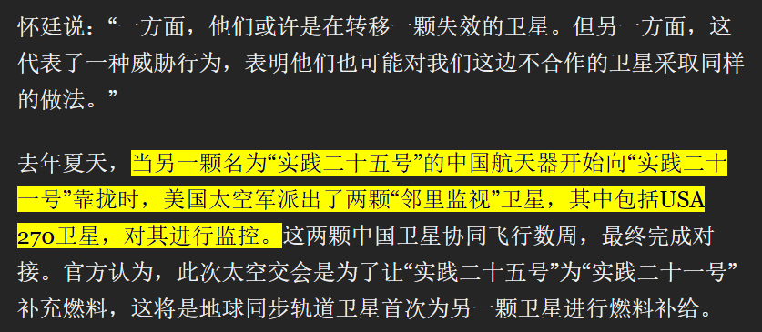 而在去年夏天,中国的另一颗实践25号卫星,开始向实践21号靠拢时,美国就派出了两颗间谍卫星去监视,其中一颗就是一开始提到的间谍270