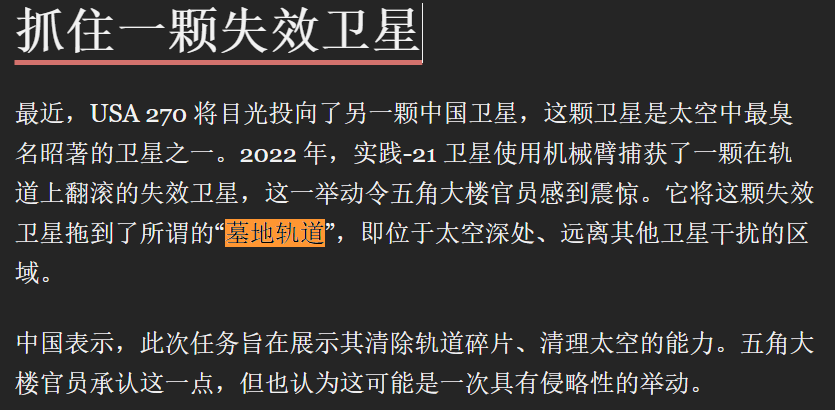 报告里还特别提到另一件事,说2022年中国的一颗卫星实践21号,在轨道捕捉了一颗失效的北斗导航卫星,并将这颗失效卫星,抓到了更高的墓地轨道,这样不会干扰其他正常卫星