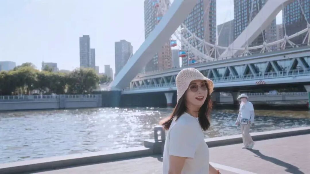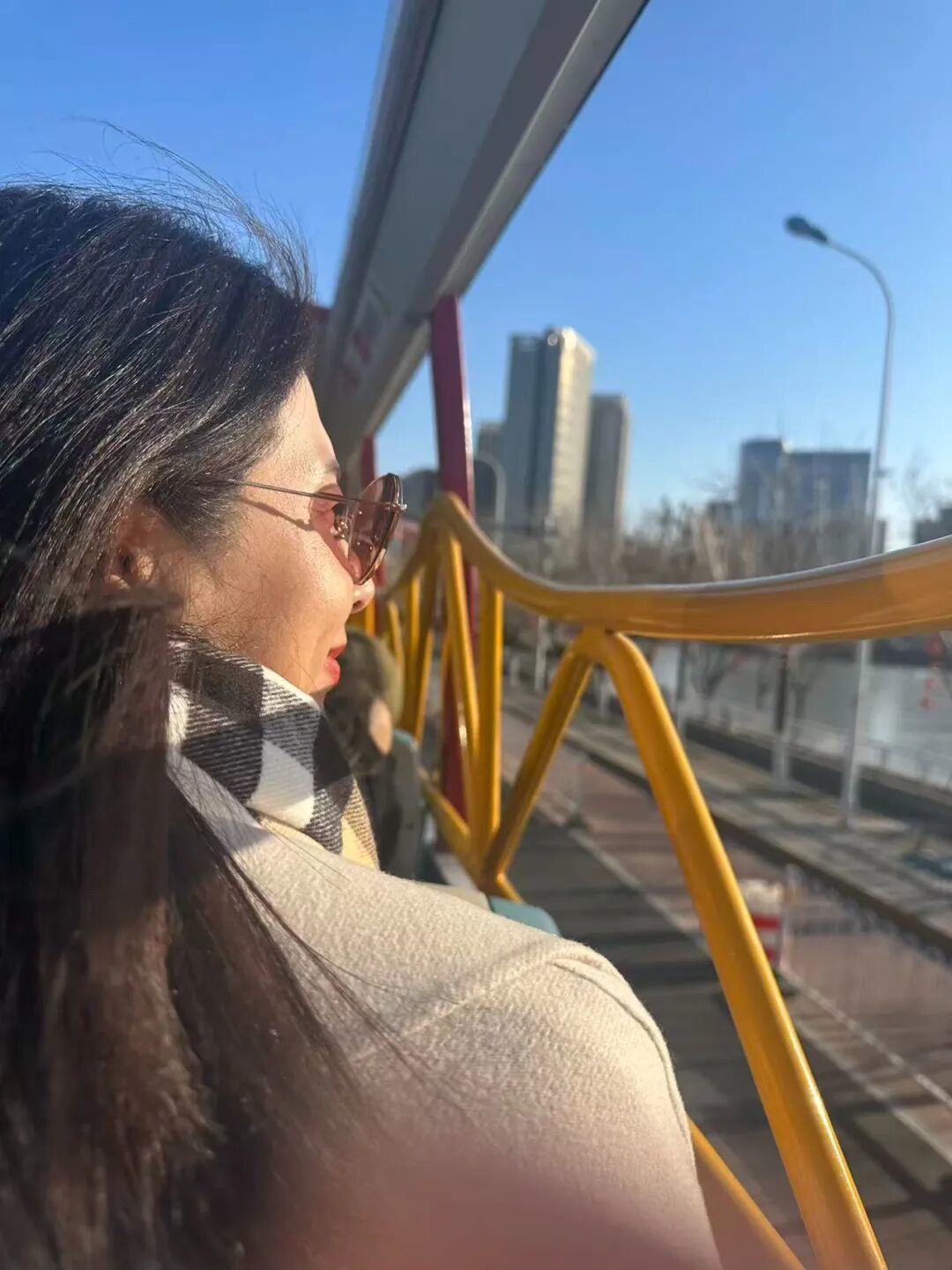 崔丽丽在丈夫的陪伴下乘坐天津观光巴士游玩。(图/受访者供图)