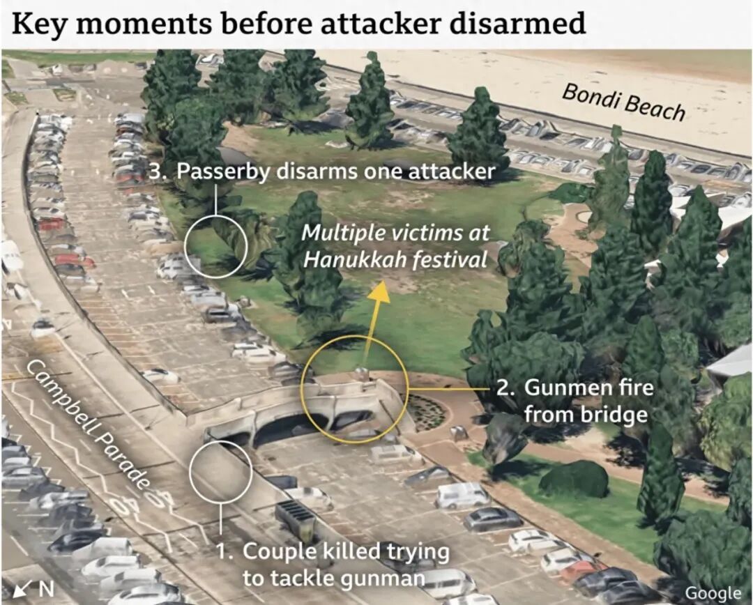 澳大利亚当地时间12月14日下午6点47分,邦迪海滩超过1000名犹太人正在欢度光明节(Hanukkah),一声枪响打破了原本欢愉的节日气氛。两名持枪者开始对参与派对的人无差别攻击。警方赶到现场后,击毙了一名枪手,另一人在逃跑过程中受伤。