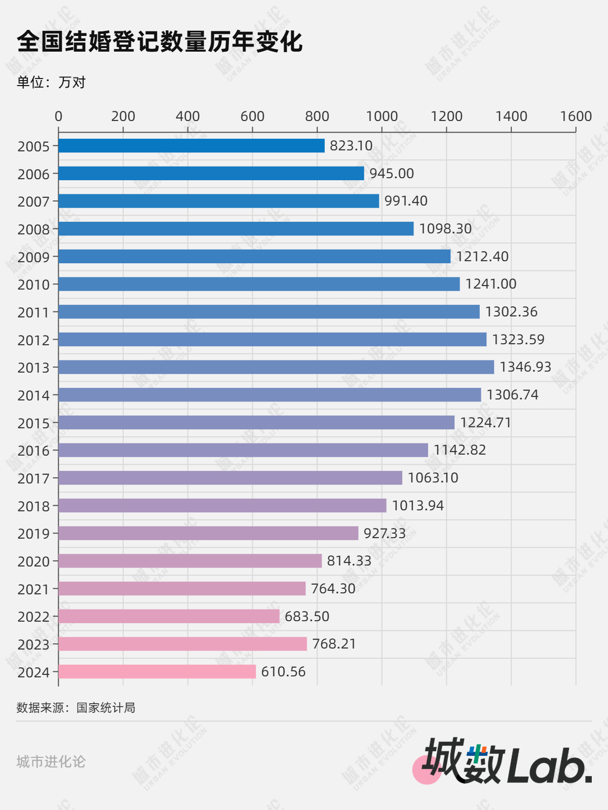 结婚人数持续减少,进一步限制了潜在生育人群规模——全国结婚登记数自2013年以来连年下降(2023年除外),2024年跌至近20年新低,已不足2013年一半。