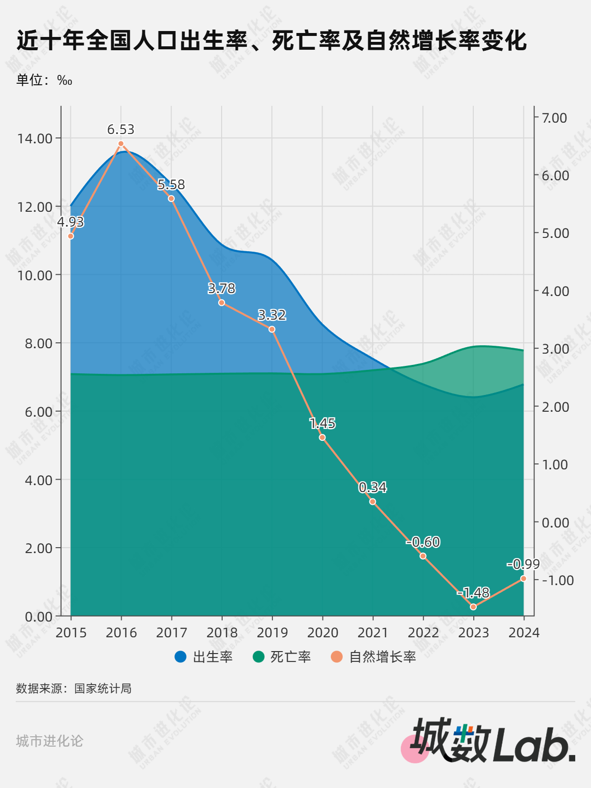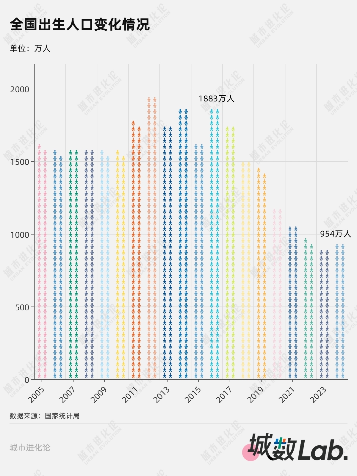 比人口规模先一步由增转降的是人口出生率。2016—2024年,全国人口出生率从13.57‰降至6.77‰,除2024年略微回升外,其余年份均呈下降趋势,其中2023年为近20年最低水平;同期,出生人口从1883万人大幅缩减至954万人,9年时间几乎“腰斩”。