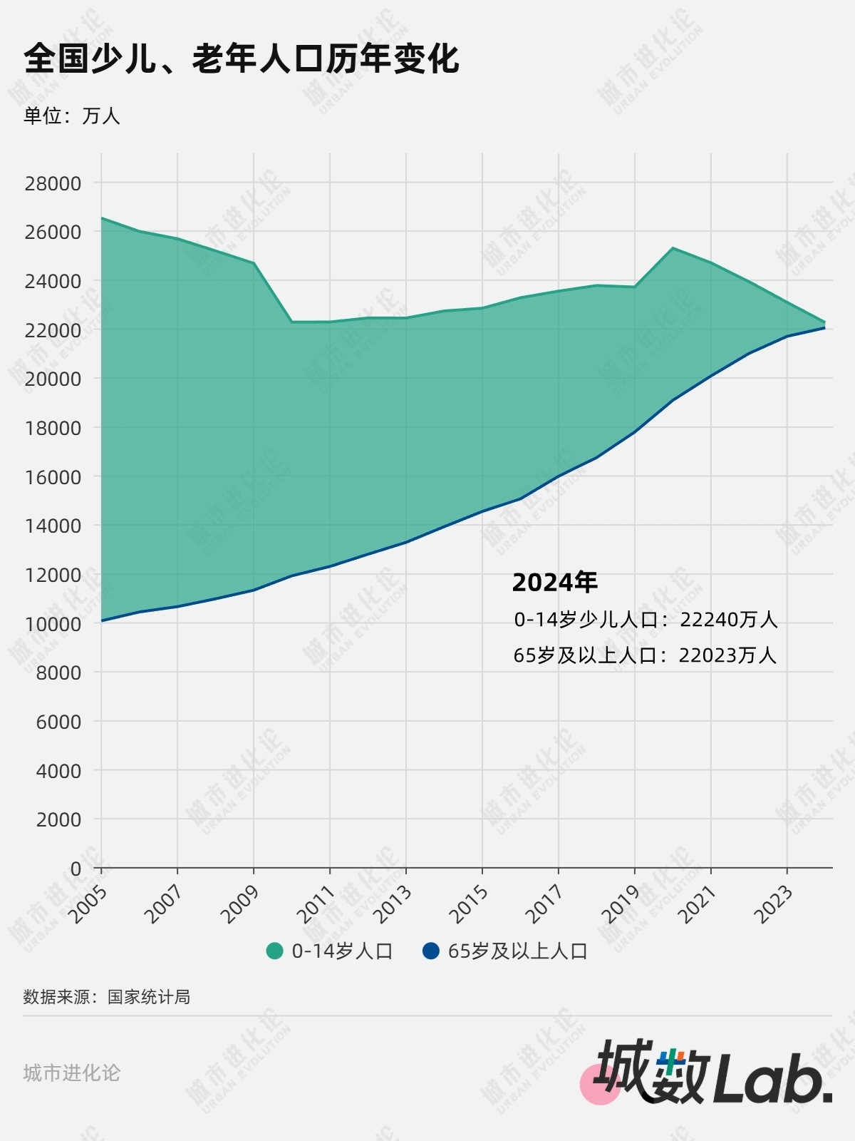 人口结构变化随之而来。2024年,我国0-14岁少儿人口跌至近20年新低,占比仅为15.8%,远低于世界平均水平;60岁及以上人口首次突破3亿人、占比22%,65周岁及以上人口占比达15.6%,少子化、老龄化趋势日益突出。