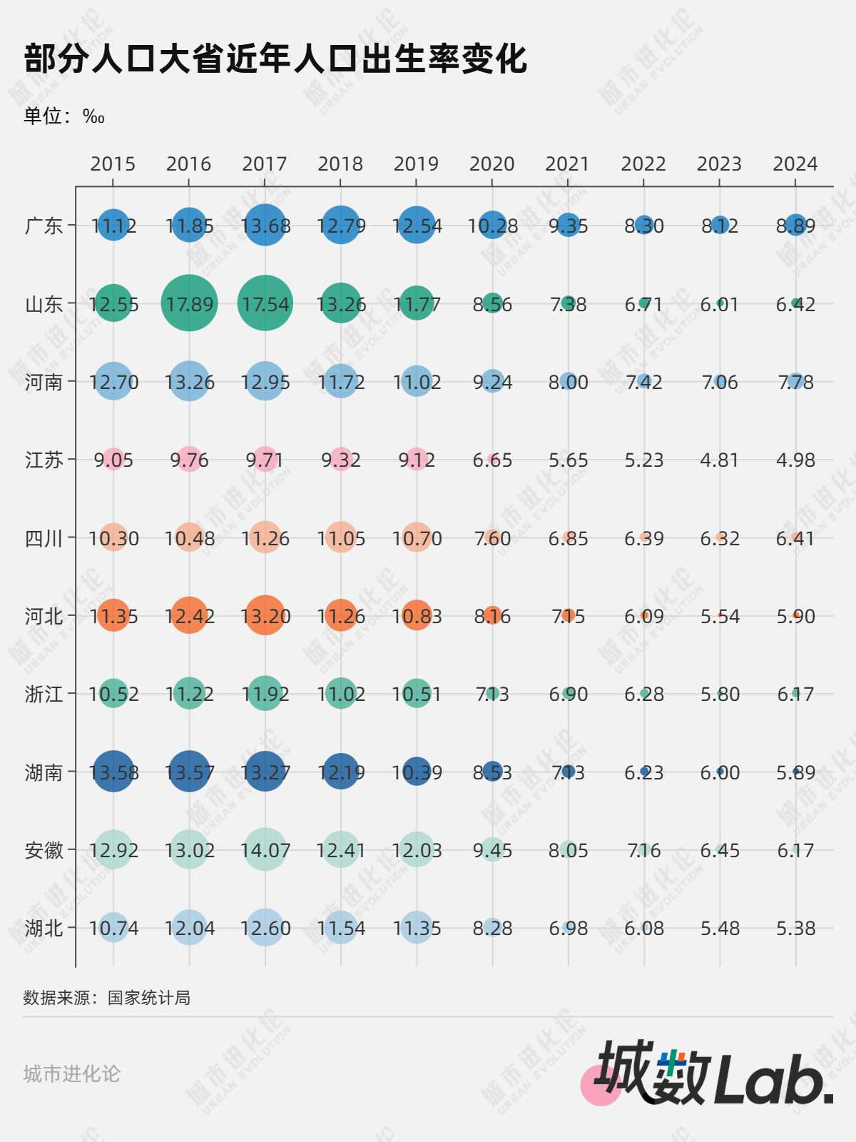 一些曾被认为“最能生”的人口大省,如广东、河南、山东等,近年人口出生率和出生人口也都出现不同程度下降。以山东为例,2024年出生人口(64.9万人)已减少至2016年(177.1万人)三成左右。