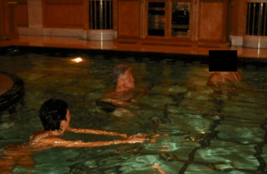 一张照片显示,克林顿在泳池中与爱泼斯坦同伙兼前女友马克斯韦尔及另一人(面部被遮盖)在一起。