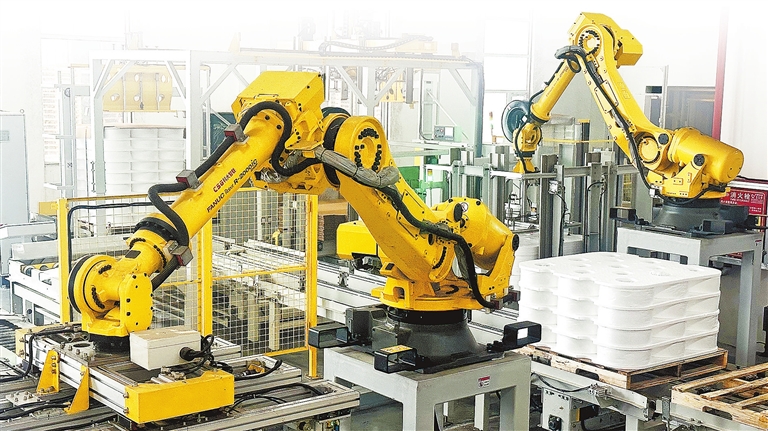 中国尼龙城企业加快智能化改造,采用智能自动包装系统打包。 齐磊 摄