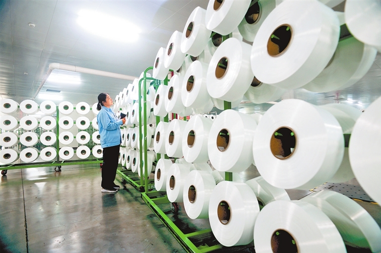 河南神马锦纶科技有限公司尼龙6民用丝一期项目正抓紧生产,职工查看尼龙6丝饼外观质量。 齐磊 摄