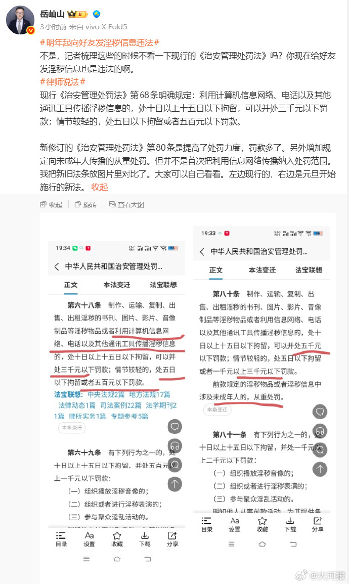 12月22日,#明年起发淫秽信息违法# 登上热搜,引发网友热议。针对相关讨论,岳屾山发文解读,现在给好友发淫秽信息同样违法,现行《治安管理处罚法》第68条明确规定:利用计算机信息网络、电话以及其他通讯工具传播淫秽信息的,处十日以上十五日以下拘留,可以并处三千元以下罚款;情节较轻的,处五日以下拘留或者五百元以下罚款。