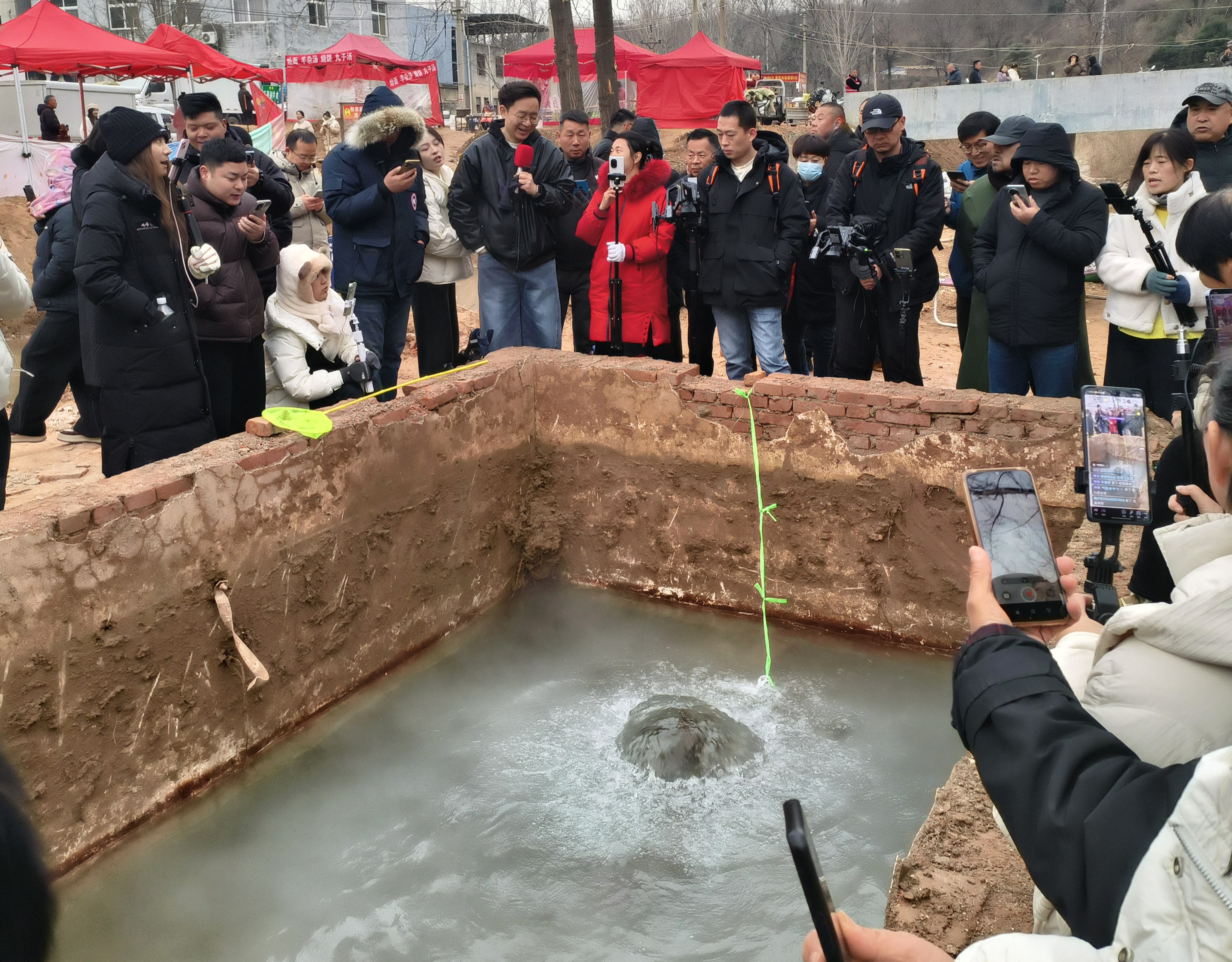 12月22日上午,大河报·豫视频记者在现场看到,原先的机井房已拆除大半,留下约50厘米高的砖墙作为临时护栏。其中,温泉眼不断向上翻涌,清晰展现在众人眼前,宛如一汪泪眼,周边是水流带起的白色泡沫。水流涌至原先机井房门口便沉寂下去,清澈见底。许多市民专程赶来拍照、直播,记录这一自然景观。