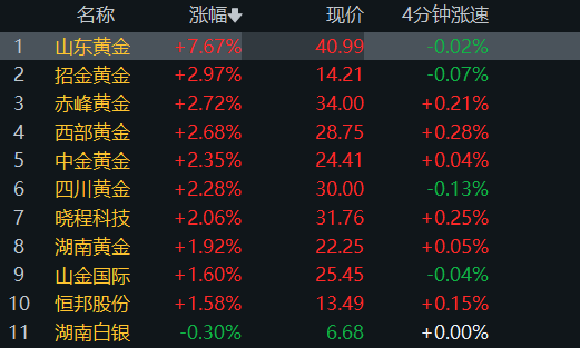二级市场上,贵金属板块也同步走强,其中,山东黄金涨超7%,招金黄金、赤峰黄金、中金黄金、西部黄金跟涨。