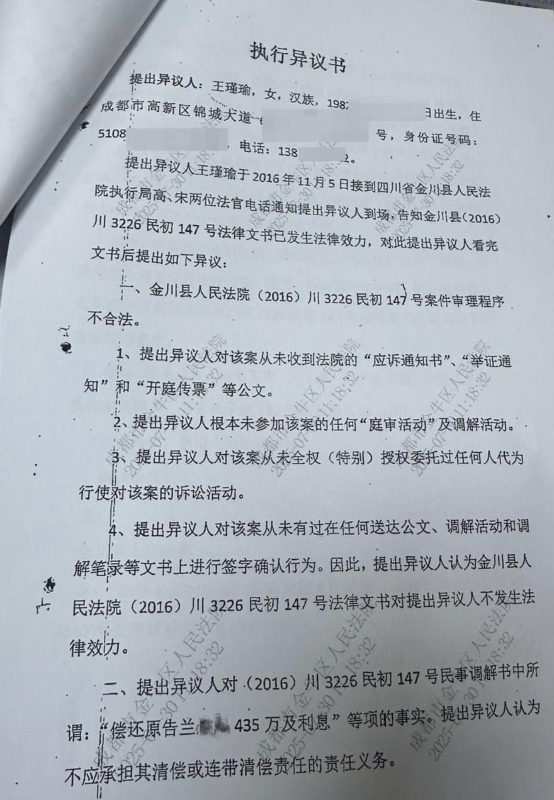 后王瑾瑜不服,称该案判决错误,自己“被调解”“被开庭”,审判程序存在违法问题,向四川高院申请再审。四川高院认为原判决的确存在错误,裁定由成都金牛区法院再审。今年7月,金牛法院再审维持原判,王瑾瑜上诉至成都中院。