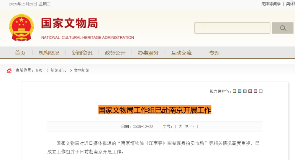 国家文物局对近日媒体报道的“南京博物院《江南春》图卷现身拍卖市场”等相关情况高度重视,已成立工作组并于日前赴南京开展工作。