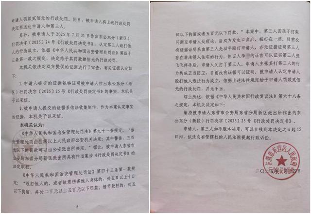 郭女士向记者提供了两份行政处罚决定书,其中一份显示,2025年2月26日19时许,张某某因孩子与郭女士儿子打架,领着自己的两个孩子到刘家理论,过程中与刘某某的姐姐小莹发生争执,双方撕打在一起。经鉴定,小莹为轻微伤。张某某殴打他人的违法行为成立,根据《治安管理处罚法》,决定给予张某某罚款肆佰元的行政处罚。