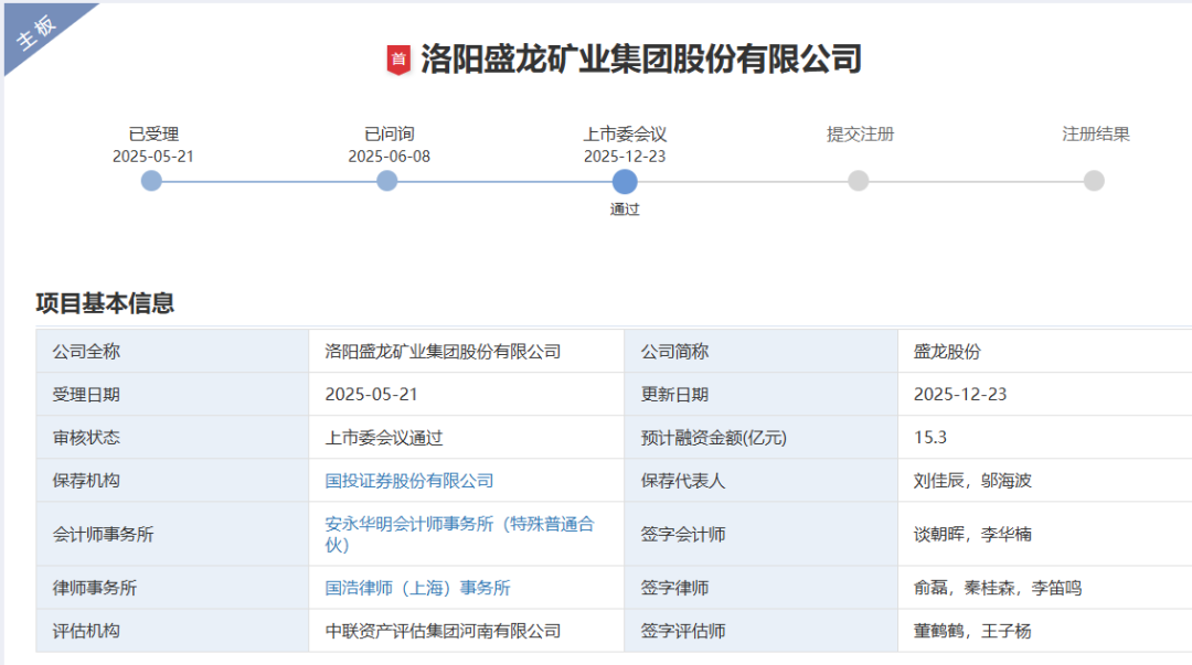 【大河财立方 记者 夏晨翔】 12月23日,深交所消息,洛阳盛龙矿业集团股份有限公司(以下简称盛龙股份)首发事项顺利通过深交所上市审核委员会审议。