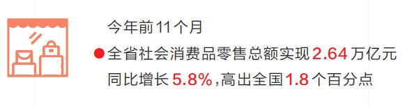 今年以来,我省抢抓节假日消费关键节点,密集发放消费券等惠民礼包,有效激发市场热情。今年前11个月,全省限额以上单位餐饮收入482.8亿元,同比增长7.2%;商品零售额实现6788.2亿元,同比增长9.1%。
