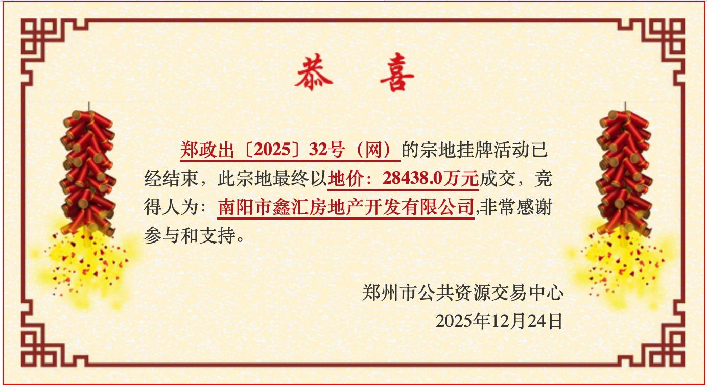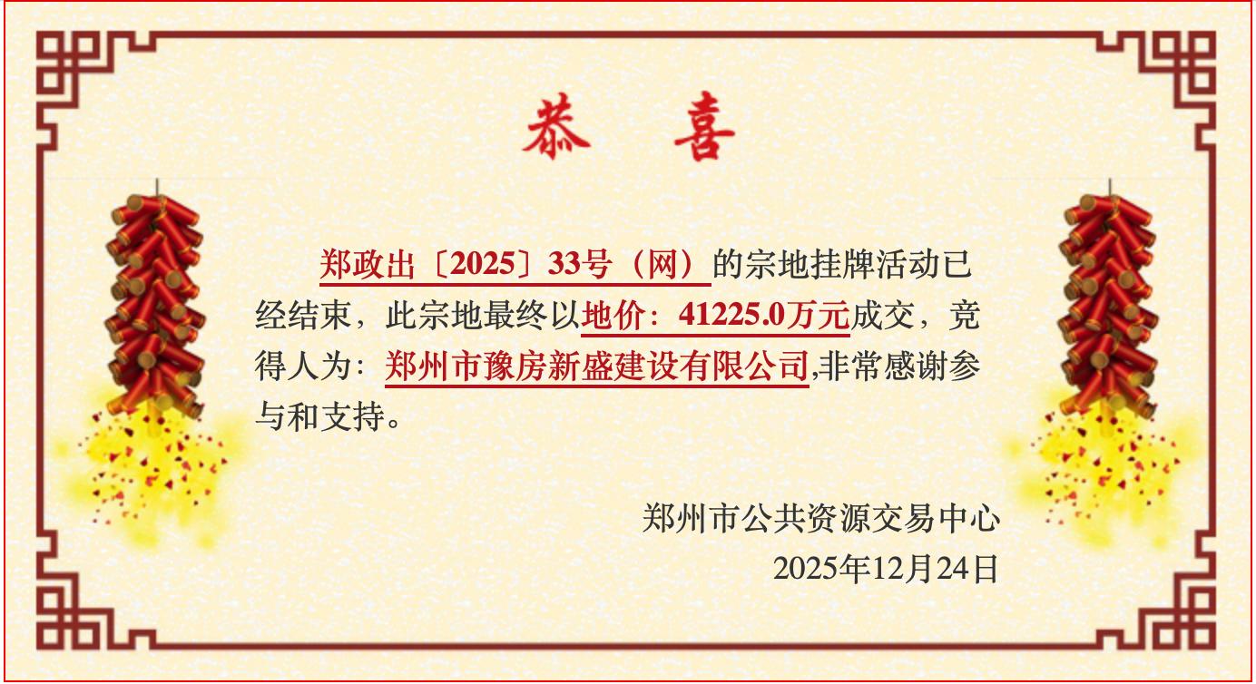 编号为郑政出〔2025〕33号(网)的地块由郑州市豫房新盛建设有限公司以底价41225万元摘得。该公司由郑州中原城市开发建设投资有限公司100%持股,实际控制人为郑州市中原区国有资产和投融资事务中心。