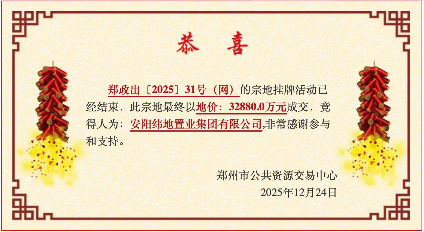 编号为郑政出〔2025〕31号(网)的地块由安阳纬地置业集团有限公司以底价32880万元摘得。该公司实际控制人为赵燕敏。