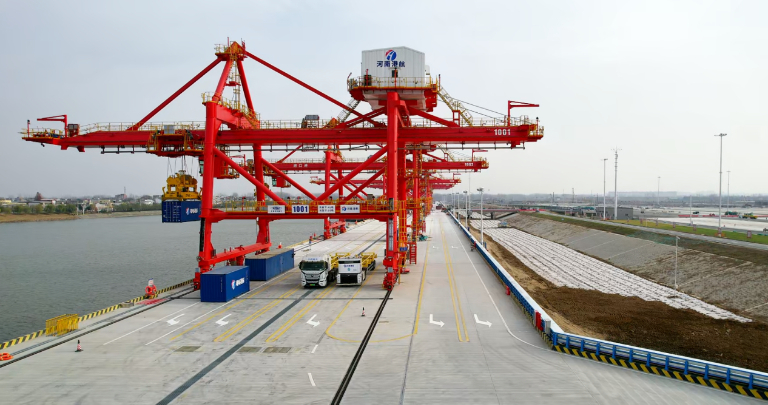 周口港中心作业区是河南省首个百万级专用集装箱码头,它的建成投用创下了当前河南省内河港口的“六个之最”,即建设规模最大、工程标准最严、运营能力最强、自动化程度最高、信息化系统最优、服务能级最好。