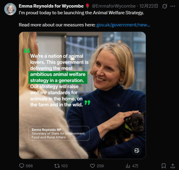 英国环境大臣艾玛·雷诺兹表示,英国是“热爱动物的国家”,政府正在“推出这一代人中最雄心勃勃的动物福利战略”。她补充说:“我们的战略将提升家中、农场和野外的动物福利标准。我们已采取行动改善动物园标准、终止幼犬走私并保护牲畜免受狗只袭击。现在我们计划禁止笼养母鸡、放置捕兽夹、追踪狩猎,并遏制低福利的犬类繁育。”