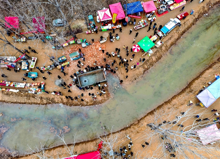 复涌的消息不胫而走,往日宁静的梨园河村也变得热闹起来。涌水点附近的河岸形成了一个临时小集市,村民们摆起小摊,售卖热饮、小吃和农产品。上百名主播全天候直播泉水复涌的景观,直播间人气不断攀升。据闫家咀社区党支部书记申留军介绍,如今从清晨到深夜,前来“打卡”的市民络绎不绝。