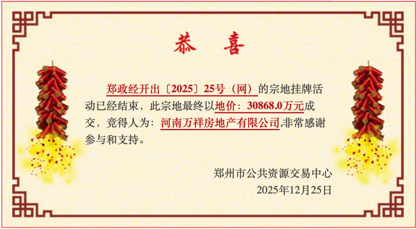 其中,编号为郑政经开出〔2025〕25号(网)的地块由河南万祥房地产有限公司以底价30868万元摘得。