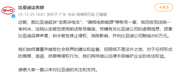 【大河财立方消息】12月25日,比亚迪法务部发文称,近期,就比亚迪起诉“龙哥讲电车”、“满格电新能源”等账号一案,公司收到法院一审判决,法院认定被告使用前述账号编造、传播有关比亚迪公司的虚假信息,损害比亚迪品牌声誉,判令被告停止侵权、消除影响,并向比亚迪公司赔偿200万元。