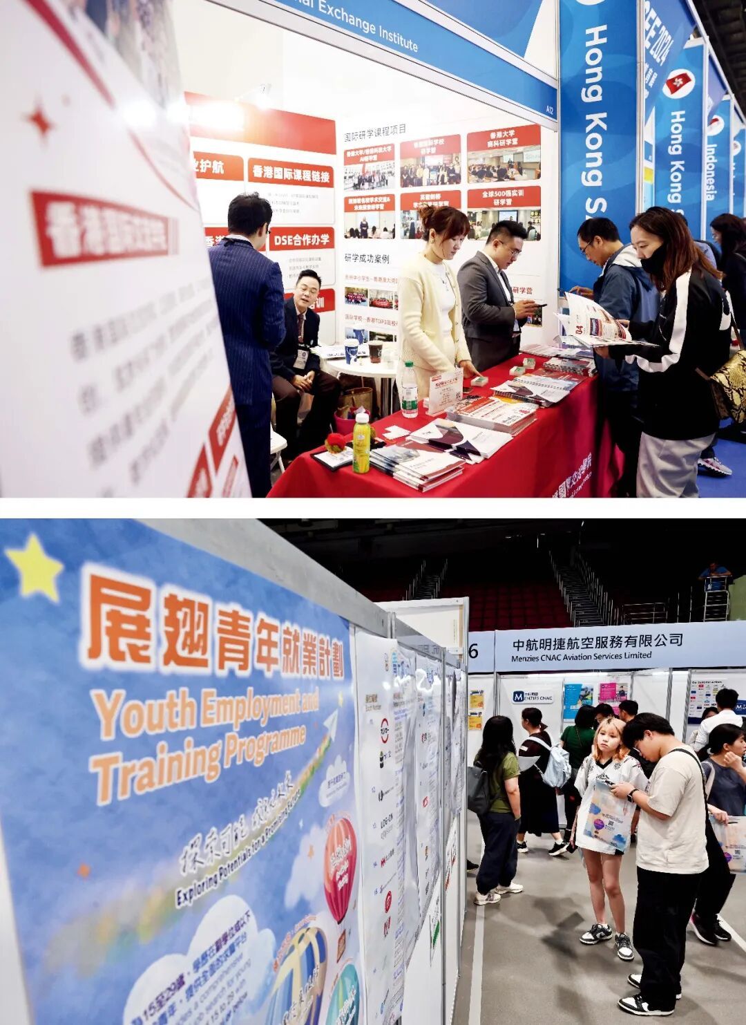 上图:2024年11月1日,2024中国国际教育展上的香港高校展区。图/视觉中国 下图:2025年6月20日,香港特区政府劳工处在湾仔修顿室内场馆举办招聘会活动。摄影/本刊记者 李志华